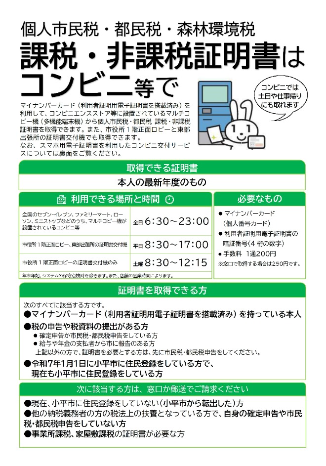 コンビニエンスストア等に設置されているマルチコピー機(多機能端末機)から、マイナンバーカード(利用者証明用電子証明書を搭載済み)を利用して、個人市民税・都民税 課税・非課税証明書を取得できます。また、市役所1階正面ロビーと東部出張所に設置してある証明書交付機でも取得できます。