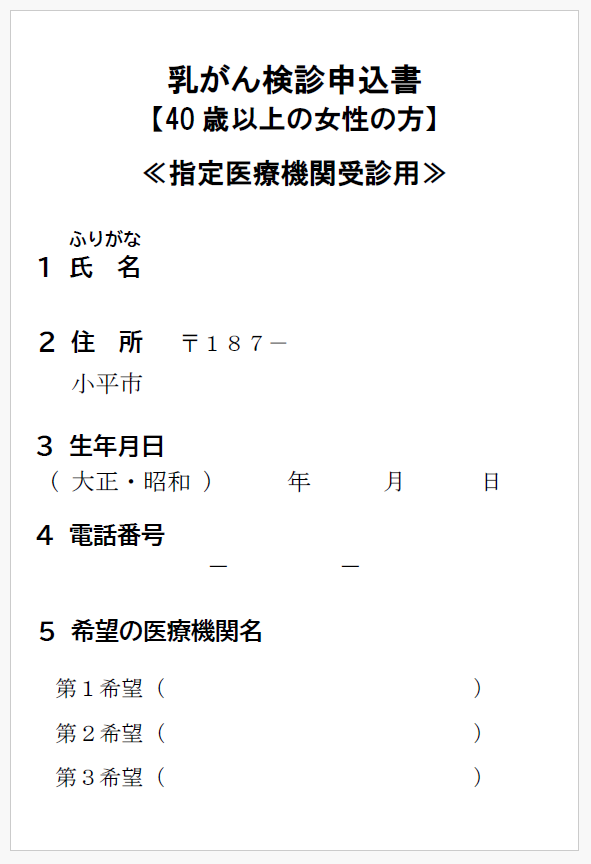 「乳がん検診申込書(40歳以上の女性の方)」≪指定医療機関受診用≫