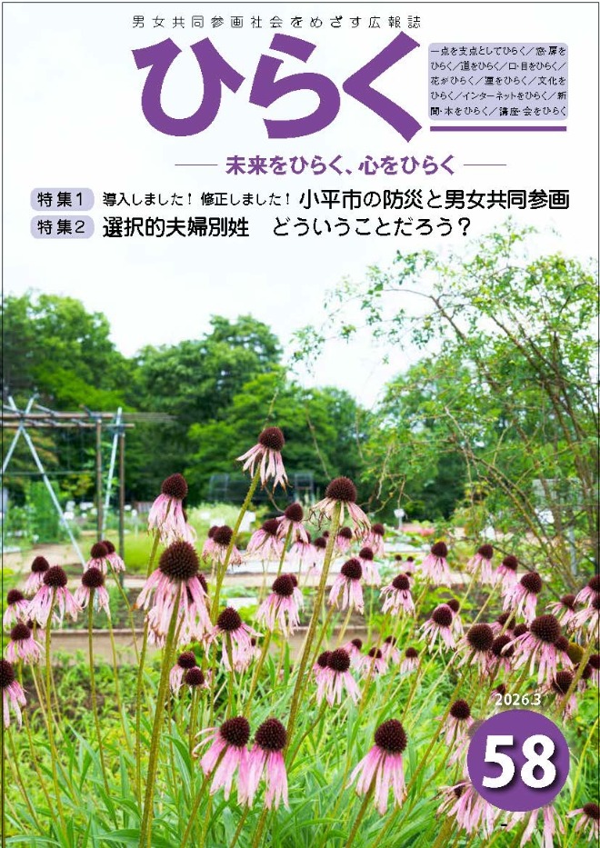 『ひらく』は公募市民である男女共同参画推進実行委員の企画・編集により、市民の視点で男女共同参画を考える広報誌です。男女が互いの人権を尊重し、誰もが生きやすい社会、住みやすい地域をつくるための広報誌であるとともに、地域に根ざした情報を提供する広報誌をめざしています。