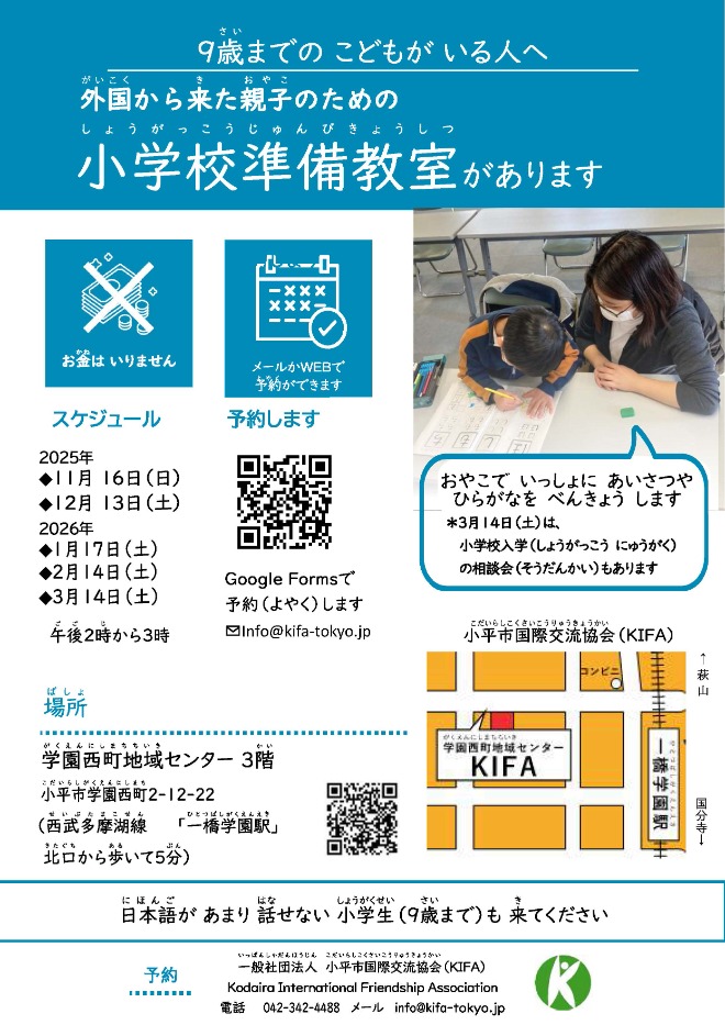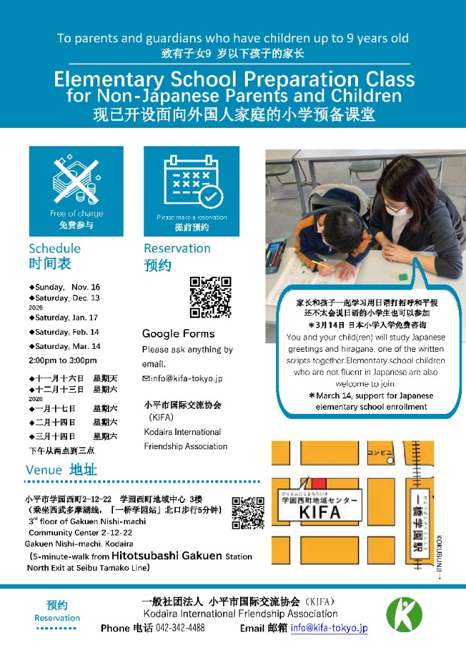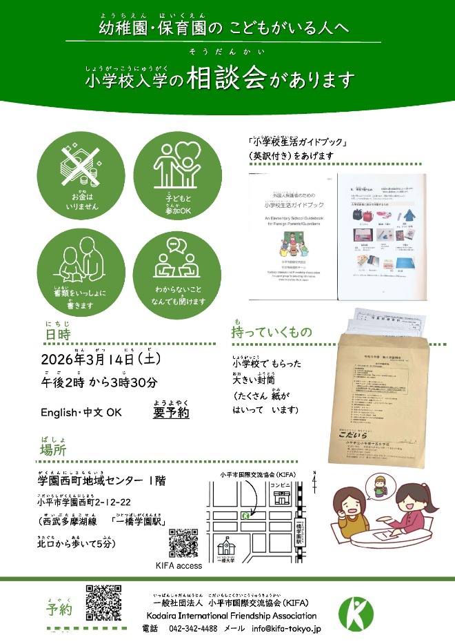 小平市国際交流協会(こだいらしこくさいこうりゅうきょうかい)(KIFA)では、小学校に入学する児童の外国人保護者向けに様々なサポートを行っています。
