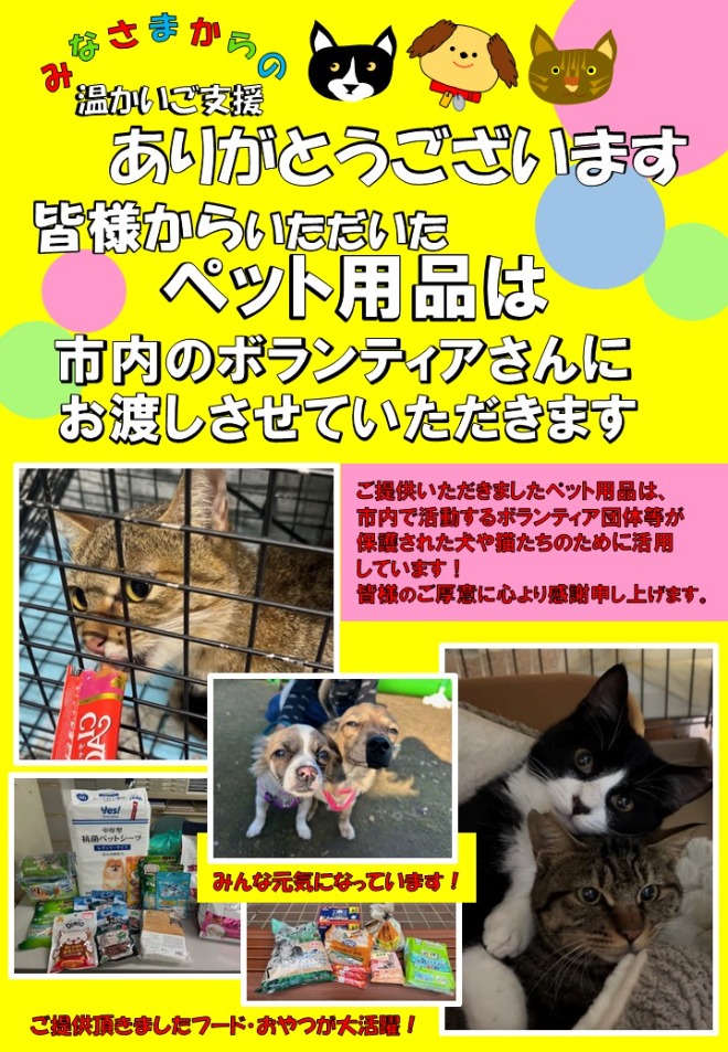 提供していただいたペット用品は、市内で保護された犬と猫のために、団体にお渡しさせていただきます。