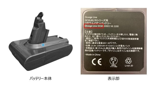 有限会社すみとも商店、ロワ・ジャパン有限会社が輸入した、ダイソン株式会社のコードレス掃除機に取り付けできる非純正のバッテリーパック(下記製品)について、充放電をしていない保管状態であっても発火のリスクがあることが判明しました。