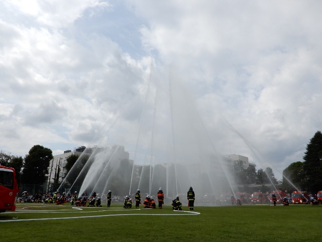 大会会場では、東京消防庁音楽隊とカラーガーズ隊による華やかな演奏・演技が披露され、続いて各消防団による基本操法演技、さらに17市消防団による迫力ある一斉放水が行われました。