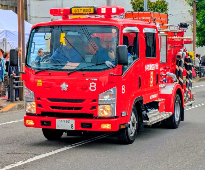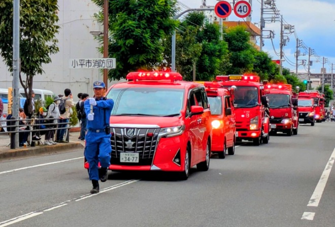 パレードでは、消防団指揮車を先頭に、可搬ポンプ車、第八分団、第九分団の消防ポンプ車が続き、小平市の目抜き通りである、あかしあ通りを行進しました。沿道から多くの皆さまに手を振っていただき、日頃訓練等に勤しんでいる消防団員にとって大変励みとなりました。温かいご支援とご声援をいただき、本当にありがとうございました。