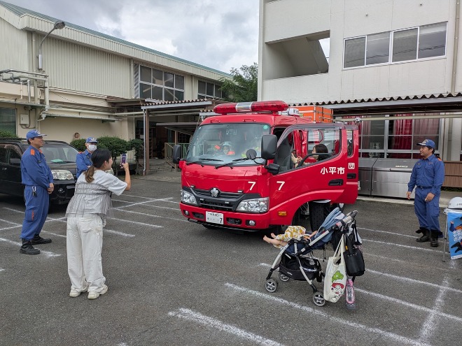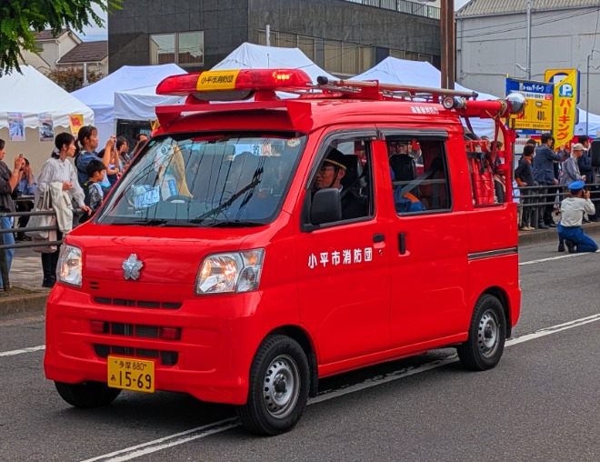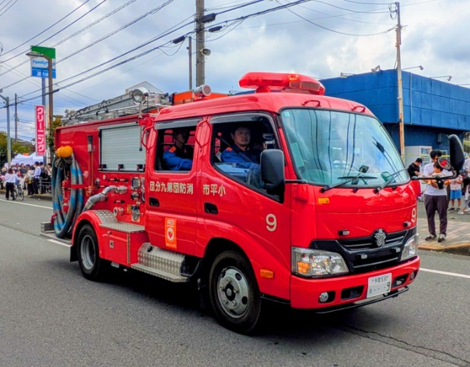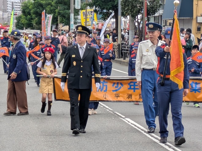 令和7年10月19日(日曜)、毎年恒例の小平市民まつりが開催され、小平市消防団が昨年に引き続きパレードに参加しました。学園東小学校の北側スペースでは、消防ポンプ車を展示して搭乗体験をしていただくなど、小さなお子さま連れの家族にも大変好評でした。