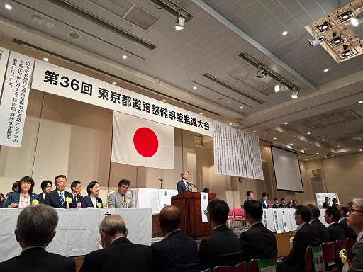 東京都区市町村主催の第36回東京都道路整備事業推進大会が開催されました。この大会は、東京の広域化する交通渋滞の緩和や、安全で快適なまちづくりに資するため、道路、橋梁、鉄道連続立体交差及び都市モノレール等の整備の促進を図ることを目的に行われています。