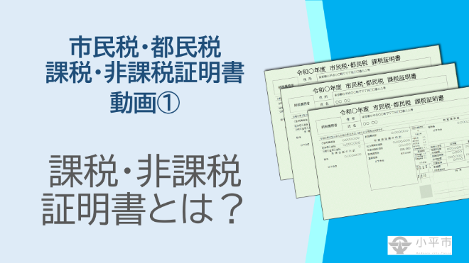 課税・非課税証明書の概要、取得方法、事前の市民税・都民税申告の方法などについて、動画で説明しています。テーマごとに7本の動画があります。また、各動画には目次にあたるタイムスタンプを用意しています。見たい場所からご覧いただくことができます。動画は、動画で見る、課税・非課税証明書、市民税・都民税申告からご覧ください。