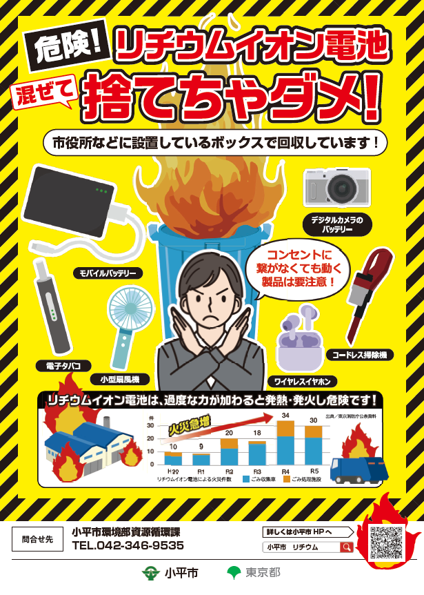 小平市では東京都と連携し、リチウムイオン電池使用製品を廃棄する際の注意喚起を促すためのポスターを作成しました。
