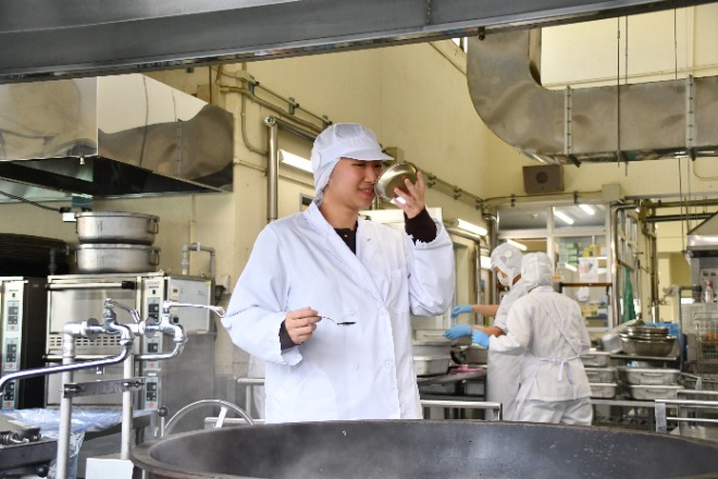 私は小学校で学校栄養職員としてこどもたちの健康を食から支える仕事をしています。栄養バランスの整った献立作成や安全に配慮した食材の発注、アレルギー対応、予算管理などが主な仕事です。また、子どもたちが正しい食習慣を身につけられるように食育活動を行ったり、給食室内の設備管理などもしています。業務内容は幅広いですがこどもたちの未来につながるのでやりがいのある仕事です。