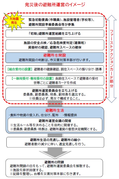 市では、避難所運営マニュアル作成の指針に基づき、発災後、どなたでも、避難所の開設を円滑に進めていただけるよう、発災初期の避難所開設の手順を簡易化した「避難所開設ファーストアクションカード(標準例)」を令和7年2月に作成しています。