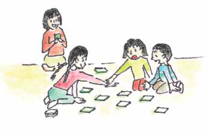 みんな自分の好きな絵札がどこにあるか、しっかり見ておくの。字の分からない小さな子は、絵を覚えておいたの。