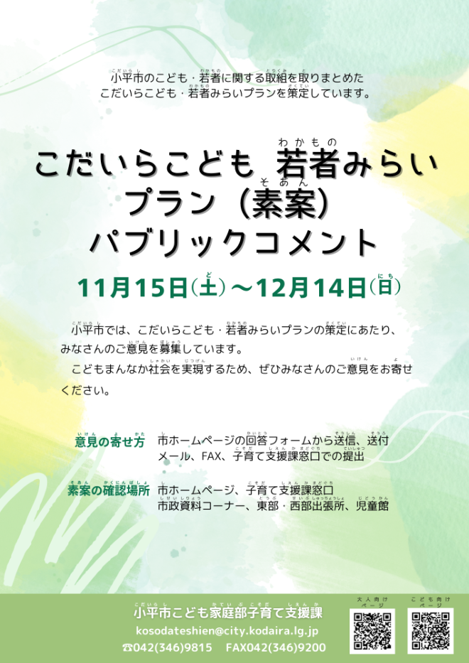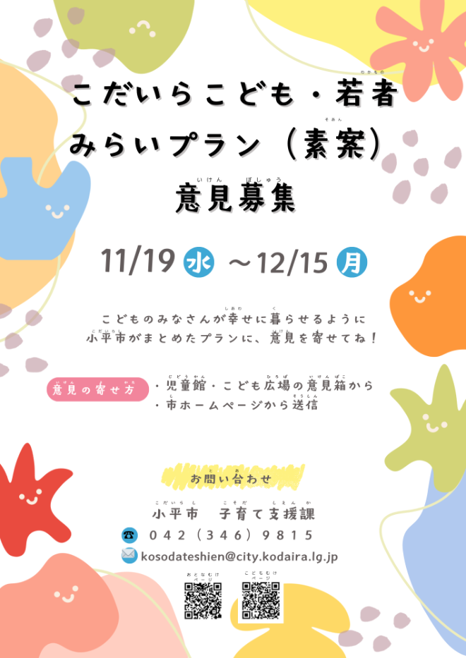 このような状況を踏まえ、市では計画期間の終了前ではありますが「小平市子ども・若者計画」を前倒しで見直すとともに、新たに「こだいらこども・若者みらいプラン」を策定します。すべてのこども・若者が幸福な生活を送れる「こどもまんなか社会」の実現を目指します。